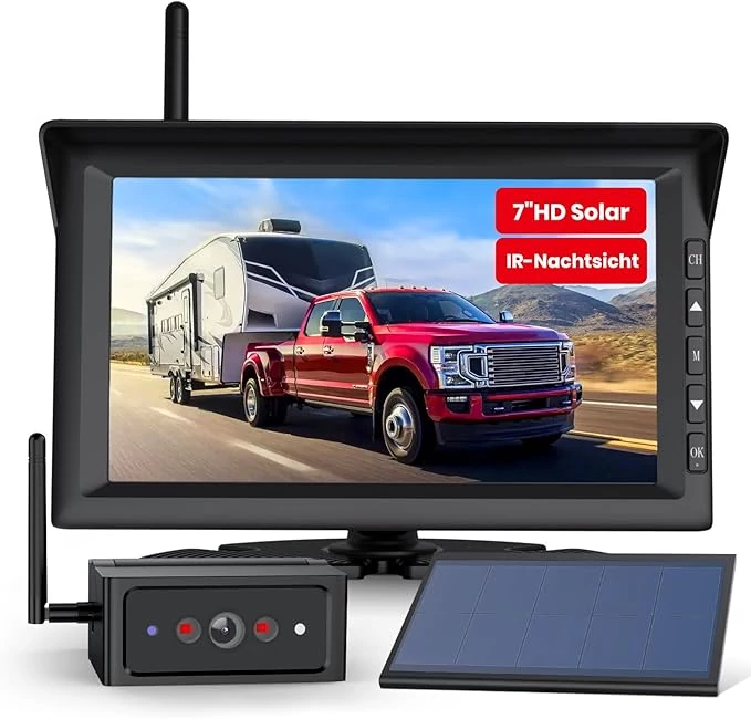 Vezeték nélküli akkus Tolatókamera és Monitor szett Kamionra, teherautóra, lakóautóra, lószállítóba (Autovox RVW solar4)